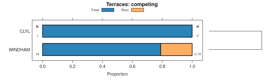 Geomorphic description summaries for the ANDREWS series and siblings. Series are sorted according to hierarchical clustering of proportions and relative hydrologic position within an idealized landform (e.g. top to bottom). Most soil series (SSURGO components) are associated with a hillslope position and one or more landform-specific positions: hills, mountain slopes, terraces, and/or flats. Proportions can be interpreted as an aggregate representation of geomorphic membership. The values printed to the left (number of component records) and right (Shannon entropy) of stacked bars can be used to judge the reliability of trends. Small Shannon entropy values suggest relatively consistent geomorphic association, while larger values suggest lack thereof. Source: SSURGO component records .