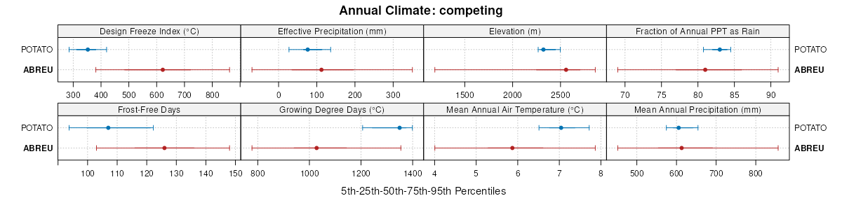 Select annual climate data summaries for the ABREU series and competing. Series are sorted according to hierarchical clustering of median values. Source: SSURGO map unit geometry and 1981-2010, 800m PRISM data .