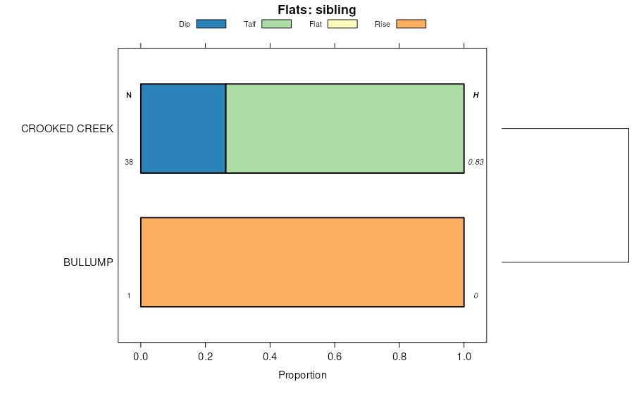 Geomorphic description summaries for the ACANA series and siblings. Series are sorted according to hierarchical clustering of proportions and relative hydrologic position within an idealized landform (e.g. top to bottom). Most soil series (SSURGO components) are associated with a hillslope position and one or more landform-specific positions: hills, mountain slopes, terraces, and/or flats. Proportions can be interpreted as an aggregate representation of geomorphic membership. The values printed to the left (number of component records) and right (Shannon entropy) of stacked bars can be used to judge the reliability of trends. Small Shannon entropy values suggest relatively consistent geomorphic association, while larger values suggest lack thereof. Source: SSURGO component records .