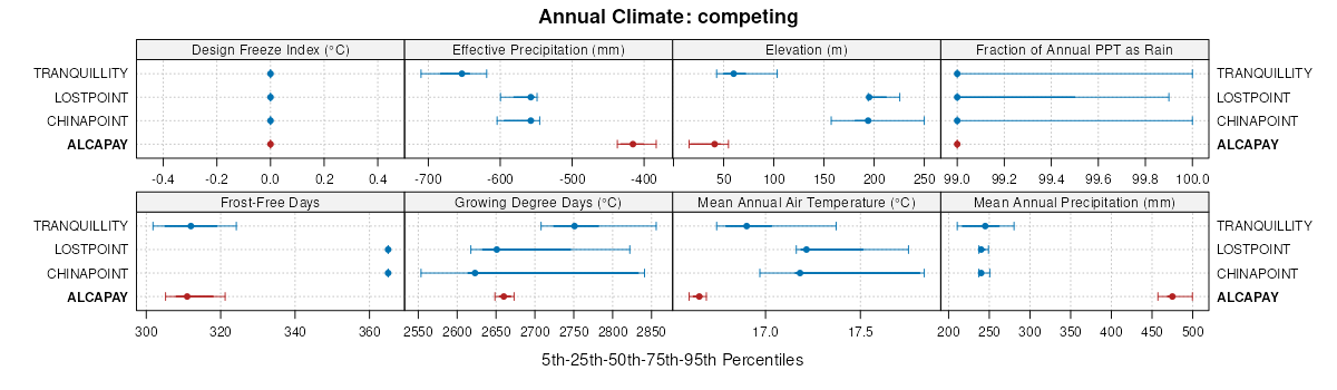 Select annual climate data summaries for the ALCAPAY series and siblings. Series are sorted according to hierarchical clustering of median values. Source: SSURGO map unit geometry and 1981-2010, 800m PRISM data .