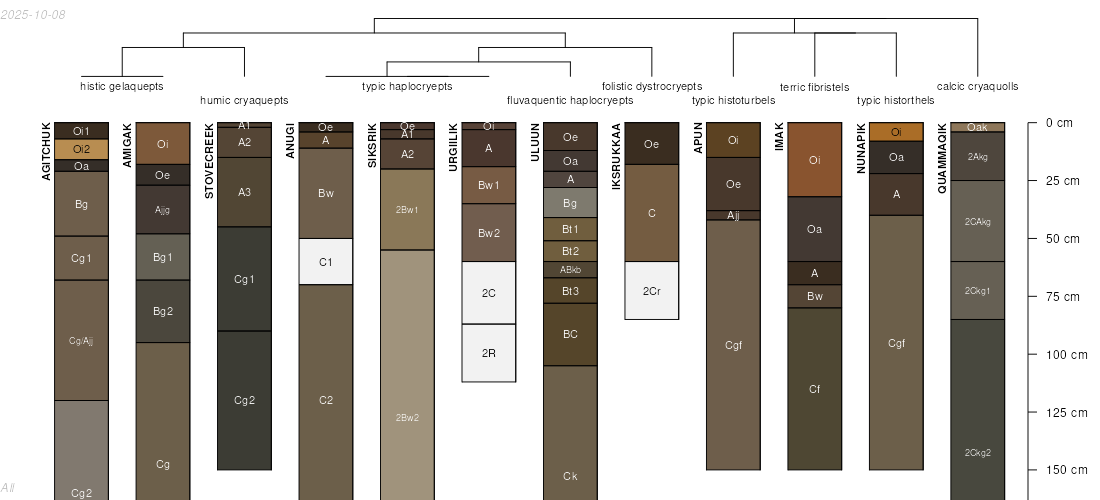 Siblings are those soil series that occur together in map units, in this case with the AMIGAK series. Sketches are arranged according to their subgroup-level taxonomic structure. Source: SSURGO snapshot , parsed OSD records and snapshot of SC database .