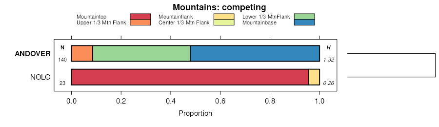 Geomorphic description summaries for the ANDOVER series and competing. Series are sorted according to hierarchical clustering of proportions and relative hydrologic position within an idealized landform (e.g. top to bottom). Proportions can be interpreted as an aggregate representation of geomorphic membership. Most soil series (SSURGO components) are associated with a hillslope position and one or more landform-specific positions: hills, mountain slopes, terraces, and/or flats. The values printed to the left (number of component records) and right (Shannon entropy) of stacked bars can be used to judge the reliability of trends. Shannon entropy values close to 0 represent soil series with relatively consistent geomorphic association, while values close to 1 suggest lack thereof. Source: SSURGO component records .