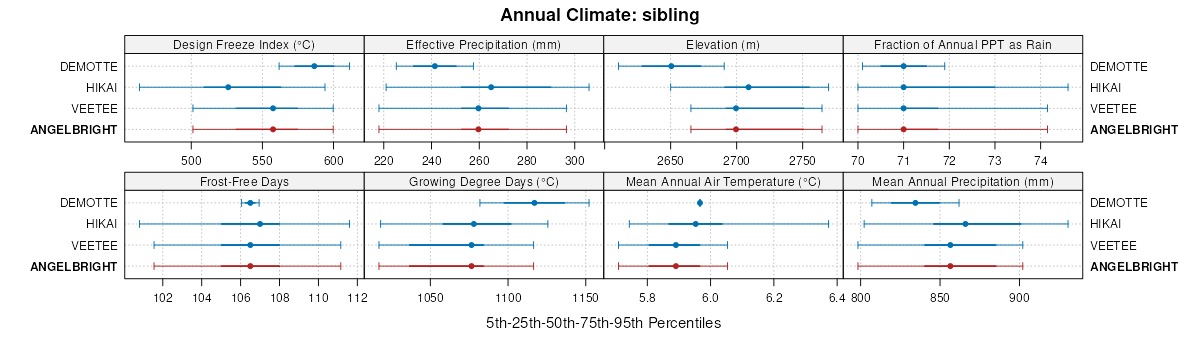 Select annual climate data summaries for the ANGELBRIGHT series and competing. Series are sorted according to hierarchical clustering of median values. Source: SSURGO map unit geometry and 1981-2010, 800m PRISM data .