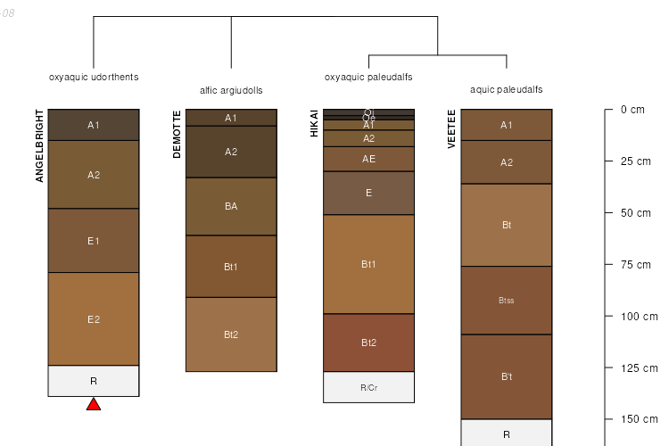 Siblings are those soil series that occur together in map units, in this case with the ANGELBRIGHT series. Sketches are arranged according to their subgroup-level taxonomic structure. Source: SSURGO snapshot , parsed OSD records and snapshot of SC database .