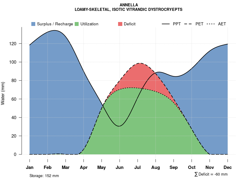 Monthly water balance estimated using a leaky-bucket style model for the ANNELLA soil series. Monthly precipitation (PPT) and potential evapotranspiration (PET) have been estimated from the 50th percentile of gridded values (PRISM 1981-2010) overlapping with the extent of SSURGO map units containing each series as a major component. Monthly PET values were estimated using the method of Thornthwaite (1948). These (and other) climatic parameters are calculated with each SSURGO refresh and provided by the fetchOSD function of the soilDB package. Representative water storage values (“AWC” in the figures) were derived from SSURGO by taking the 50th percentile of profile-total water storage (sum[awc_r * horizon thickness]) for each soil series. Note that this representation of “water storage” is based on the average ability of most plants to extract soil water between 15 bar (“permanent wilting point”) and 1/3 bar (“field capacity”) matric potential. Soil moisture state can be roughly interpreted as “dry” when storage is depleted, “moist” when storage is between 0mm and AWC, and “wet” when there is a surplus. Clearly there are a lot of assumptions baked into this kind of monthly water balance. This is still a work in progress.