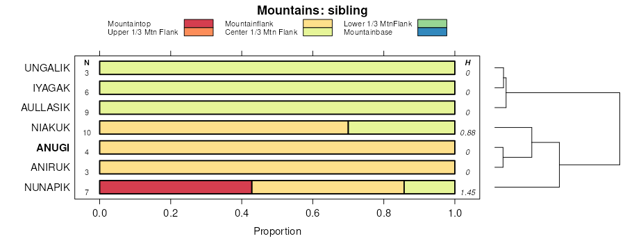 Geomorphic description summaries for the ANUGI series and siblings. Series are sorted according to hierarchical clustering of proportions and relative hydrologic position within an idealized landform (e.g. top to bottom). Most soil series (SSURGO components) are associated with a hillslope position and one or more landform-specific positions: hills, mountain slopes, terraces, and/or flats. Proportions can be interpreted as an aggregate representation of geomorphic membership. The values printed to the left (number of component records) and right (Shannon entropy) of stacked bars can be used to judge the reliability of trends. Small Shannon entropy values suggest relatively consistent geomorphic association, while larger values suggest lack thereof. Source: SSURGO component records .