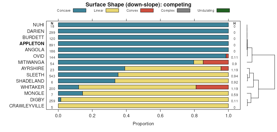 Geomorphic description summaries for the APPLETON series and competing. Series are sorted according to hierarchical clustering of proportions and relative hydrologic position within an idealized landform (e.g. top to bottom). Most soil series (SSURGO components) are associated with a two-dimensional hillslope position and one or more landform-specific, three-dimensional positions: hills, mountain slopes, terraces, and/or flats. The land surface curvature is described across-slope and down-slope. Proportions can be interpreted as an aggregate representation of geomorphic membership. The values printed to the left (number of component records) and right (Shannon entropy) of stacked bars can be used to judge the reliability of trends. Small Shannon entropy values suggest relatively consistent geomorphic association, while larger values suggest lack thereof. Source: SSURGO component records . Learn more about how these data were prepared.