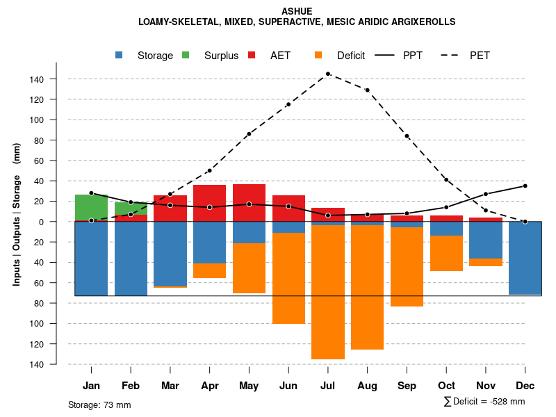 Monthly water balance estimated using a leaky-bucket style model for the ASHUE soil series. Monthly precipitation (PPT) and potential evapotranspiration (PET) have been estimated from the 50th percentile of gridded values (PRISM 1981-2010) overlapping with the extent of SSURGO map units containing each series as a major component. Monthly PET values were estimated using the method of Thornthwaite (1948). These (and other) climatic parameters are calculated with each SSURGO refresh and provided by the fetchOSD function of the soilDB package. Representative water storage values (“AWC” in the figures) were derived from SSURGO by taking the 50th percentile of profile-total water storage (sum[awc_r * horizon thickness]) for each soil series. Note that this representation of “water storage” is based on the average ability of most plants to extract soil water between 15 bar (“permanent wilting point”) and 1/3 bar (“field capacity”) matric potential. Soil moisture state can be roughly interpreted as “dry” when storage is depleted, “moist” when storage is between 0mm and AWC, and “wet” when there is a surplus. Clearly there are a lot of assumptions baked into this kind of monthly water balance. This is still a work in progress.
