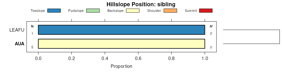 Geomorphic description summaries for the AUA series and siblings. Series are sorted according to hierarchical clustering of proportions and relative hydrologic position within an idealized landform (e.g. top to bottom). Most soil series (SSURGO components) are associated with a hillslope position and one or more landform-specific positions: hills, mountain slopes, terraces, and/or flats. Proportions can be interpreted as an aggregate representation of geomorphic membership. The values printed to the left (number of component records) and right (Shannon entropy) of stacked bars can be used to judge the reliability of trends. Small Shannon entropy values suggest relatively consistent geomorphic association, while larger values suggest lack thereof. Source: SSURGO component records .
