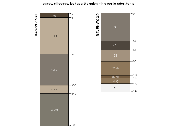 Siblings are those soil series that occur together in map units, in this case with the BAGGS CAPE series. Sketches are arranged according to their subgroup-level taxonomic structure. Source: SSURGO snapshot , parsed OSD records and snapshot of SC database .