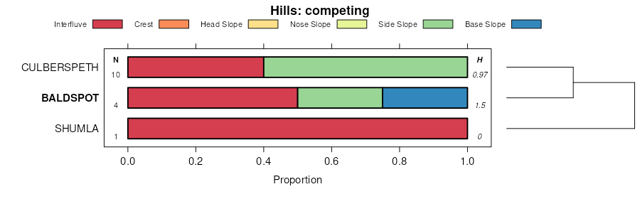 Geomorphic description summaries for the BALDSPOT series and competing. Series are sorted according to hierarchical clustering of proportions and relative hydrologic position within an idealized landform (e.g. top to bottom). Proportions can be interpreted as an aggregate representation of geomorphic membership. Most soil series (SSURGO components) are associated with a hillslope position and one or more landform-specific positions: hills, mountain slopes, terraces, and/or flats. The values printed to the left (number of component records) and right (Shannon entropy) of stacked bars can be used to judge the reliability of trends. Shannon entropy values close to 0 represent soil series with relatively consistent geomorphic association, while values close to 1 suggest lack thereof. Source: SSURGO component records .