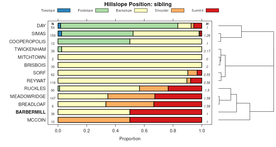 Geomorphic description summaries for the BARBERMILL series and competing. Series are sorted according to hierarchical clustering of proportions and relative hydrologic position within an idealized landform (e.g. top to bottom). Proportions can be interpreted as an aggregate representation of geomorphic membership. Most soil series (SSURGO components) are associated with a hillslope position and one or more landform-specific positions: hills, mountain slopes, terraces, and/or flats. The values printed to the left (number of component records) and right (Shannon entropy) of stacked bars can be used to judge the reliability of trends. Shannon entropy values close to 0 represent soil series with relatively consistent geomorphic association, while values close to 1 suggest lack thereof. Source: SSURGO component records .