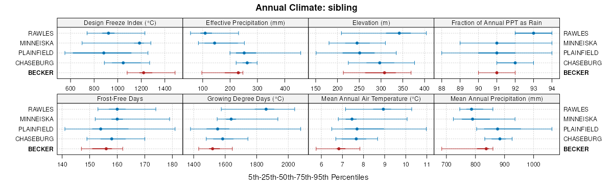 Select annual climate data summaries for the BECKER series and competing. Series are sorted according to hierarchical clustering of median values. Source: SSURGO map unit geometry and 1981-2010, 800m PRISM data .