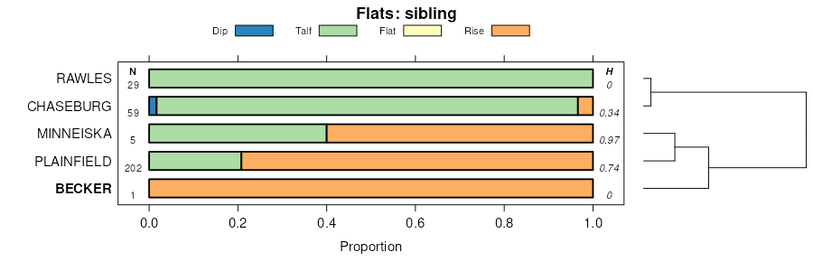 Geomorphic description summaries for the BECKER series and siblings. Series are sorted according to hierarchical clustering of proportions and relative hydrologic position within an idealized landform (e.g. top to bottom). Most soil series (SSURGO components) are associated with a hillslope position and one or more landform-specific positions: hills, mountain slopes, terraces, and/or flats. Proportions can be interpreted as an aggregate representation of geomorphic membership. The values printed to the left (number of component records) and right (Shannon entropy) of stacked bars can be used to judge the reliability of trends. Small Shannon entropy values suggest relatively consistent geomorphic association, while larger values suggest lack thereof. Source: SSURGO component records .