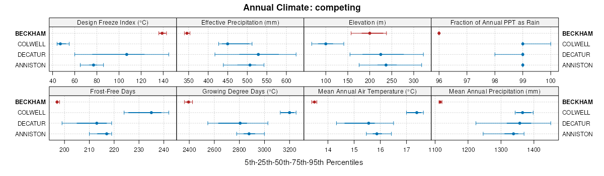 Select annual climate data summaries for the BECKHAM series and competing. Series are sorted according to hierarchical clustering of median values. Source: SSURGO map unit geometry and 1981-2010, 800m PRISM data .