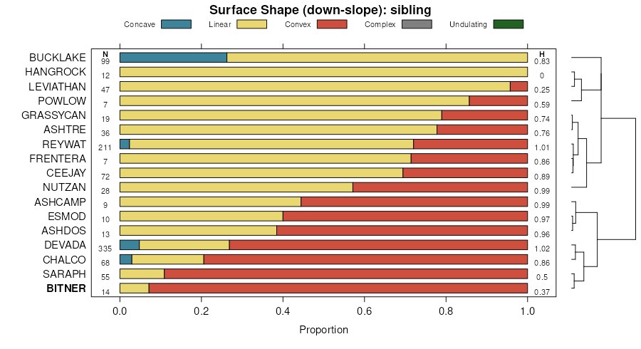 Geomorphic description summaries for the BITNER series and competing. Series are sorted according to hierarchical clustering of proportions and relative hydrologic position within an idealized landform (e.g. top to bottom). Most soil series (SSURGO components) are associated with a two-dimensional hillslope position and one or more landform-specific, three-dimensional positions: hills, mountain slopes, terraces, and/or flats. The land surface curvature is described across-slope and down-slope. Proportions can be interpreted as an aggregate representation of geomorphic membership. The values printed to the left (number of component records) and right (Shannon entropy) of stacked bars can be used to judge the reliability of trends. Small Shannon entropy values suggest relatively consistent geomorphic association, while larger values suggest lack thereof. Source: SSURGO component records . Learn more about how these data were prepared.