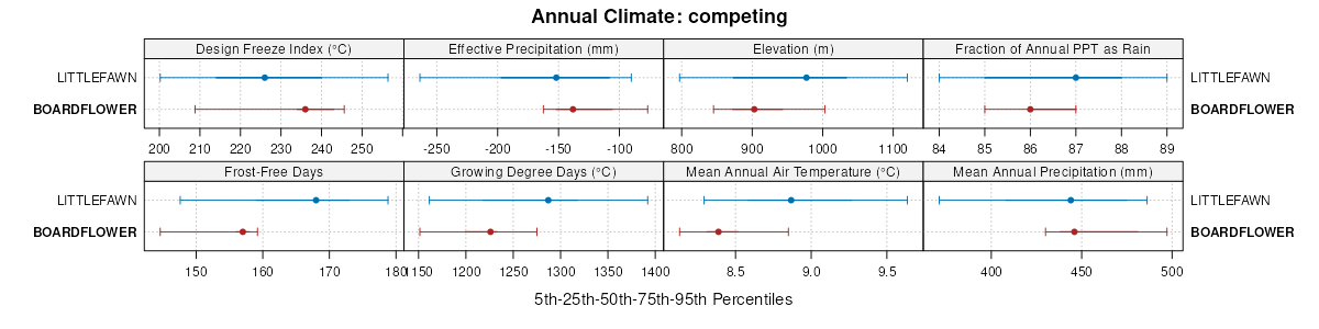 Select annual climate data summaries for the BOARDFLOWER series and competing. Series are sorted according to hierarchical clustering of median values. Source: SSURGO map unit geometry and 1981-2010, 800m PRISM data .