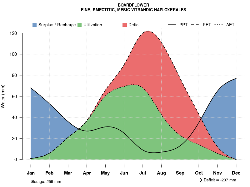 Monthly water balance estimated using a leaky-bucket style model for the BOARDFLOWER soil series. Monthly precipitation (PPT) and potential evapotranspiration (PET) have been estimated from the 50th percentile of gridded values (PRISM 1981-2010) overlapping with the extent of SSURGO map units containing each series as a major component. Monthly PET values were estimated using the method of Thornthwaite (1948). These (and other) climatic parameters are calculated with each SSURGO refresh and provided by the fetchOSD function of the soilDB package. Representative water storage values (“AWC” in the figures) were derived from SSURGO by taking the 50th percentile of profile-total water storage (sum[awc_r * horizon thickness]) for each soil series. Note that this representation of “water storage” is based on the average ability of most plants to extract soil water between 15 bar (“permanent wilting point”) and 1/3 bar (“field capacity”) matric potential. Soil moisture state can be roughly interpreted as “dry” when storage is depleted, “moist” when storage is between 0mm and AWC, and “wet” when there is a surplus. Clearly there are a lot of assumptions baked into this kind of monthly water balance. This is still a work in progress.