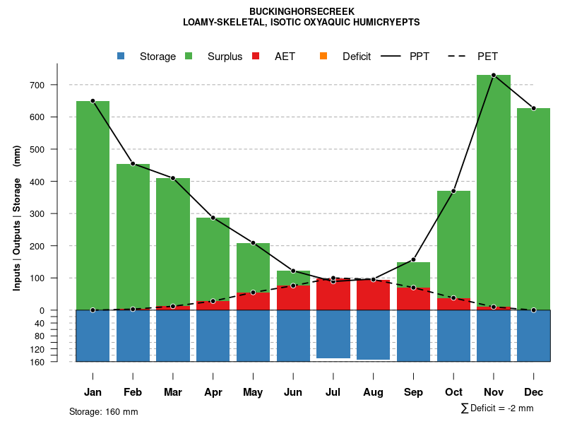 Monthly water balance estimated using a leaky-bucket style model for the BUCKINGHORSECREEK soil series. Monthly precipitation (PPT) and potential evapotranspiration (PET) have been estimated from the 50th percentile of gridded values (PRISM 1981-2010) overlapping with the extent of SSURGO map units containing each series as a major component. Monthly PET values were estimated using the method of Thornthwaite (1948). These (and other) climatic parameters are calculated with each SSURGO refresh and provided by the fetchOSD function of the soilDB package. Representative water storage values (“AWC” in the figures) were derived from SSURGO by taking the 50th percentile of profile-total water storage (sum[awc_r * horizon thickness]) for each soil series. Note that this representation of “water storage” is based on the average ability of most plants to extract soil water between 15 bar (“permanent wilting point”) and 1/3 bar (“field capacity”) matric potential. Soil moisture state can be roughly interpreted as “dry” when storage is depleted, “moist” when storage is between 0mm and AWC, and “wet” when there is a surplus. Clearly there are a lot of assumptions baked into this kind of monthly water balance. This is still a work in progress.