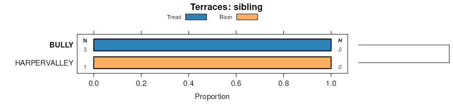 Geomorphic description summaries for the BULLY series and siblings. Series are sorted according to hierarchical clustering of proportions and relative hydrologic position within an idealized landform (e.g. top to bottom). Most soil series (SSURGO components) are associated with a hillslope position and one or more landform-specific positions: hills, mountain slopes, terraces, and/or flats. Proportions can be interpreted as an aggregate representation of geomorphic membership. The values printed to the left (number of component records) and right (Shannon entropy) of stacked bars can be used to judge the reliability of trends. Small Shannon entropy values suggest relatively consistent geomorphic association, while larger values suggest lack thereof. Source: SSURGO component records .
