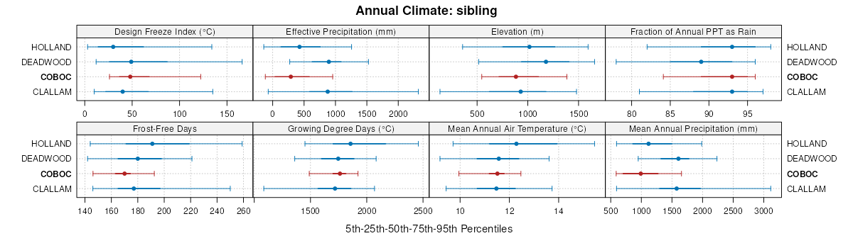 Select annual climate data summaries for the COBOC series and competing. Series are sorted according to hierarchical clustering of median values. Source: SSURGO map unit geometry and 1981-2010, 800m PRISM data .