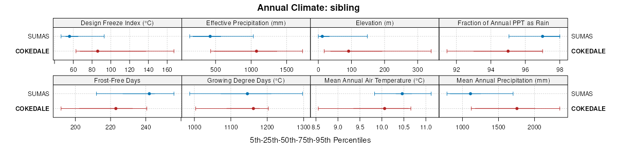 Select annual climate data summaries for the COKEDALE series and competing. Series are sorted according to hierarchical clustering of median values. Source: SSURGO map unit geometry and 1981-2010, 800m PRISM data .