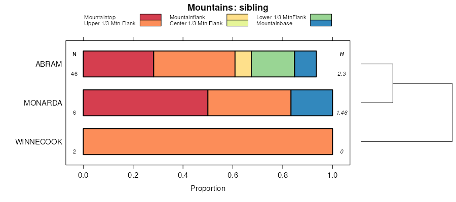 Proportions can be interpreted as an aggregate representation of geomorphic membership. The values printed to the left (number of component records) and right (Shannon entropy) of stacked bars can be used to judge the reliability of trends. Small Shannon entropy values suggest relatively consistent geomorphic association, while larger values suggest lack thereof. Source: SSURGO component records (updated 2025-10-06).