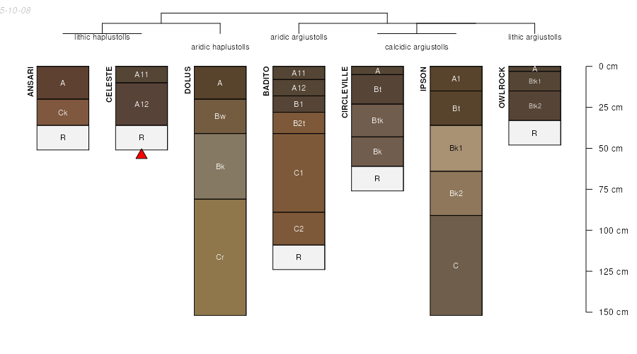 Siblings are those soil series that occur together in map units, in this case with the CELESTE series. Sketches are arranged according to their subgroup-level taxonomic structure. Source: SSURGO snapshot , parsed OSD records and snapshot of SC database .
