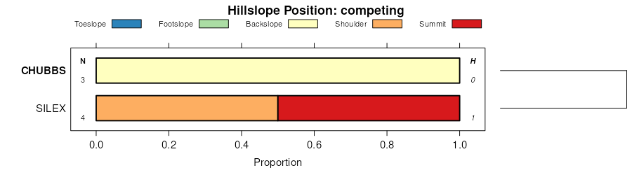 Geomorphic description summaries for the CHUBBS series and competing. Series are sorted according to hierarchical clustering of proportions and relative hydrologic position within an idealized landform (e.g. top to bottom). Proportions can be interpreted as an aggregate representation of geomorphic membership. Most soil series (SSURGO components) are associated with a hillslope position and one or more landform-specific positions: hills, mountain slopes, terraces, and/or flats. The values printed to the left (number of component records) and right (Shannon entropy) of stacked bars can be used to judge the reliability of trends. Shannon entropy values close to 0 represent soil series with relatively consistent geomorphic association, while values close to 1 suggest lack thereof. Source: SSURGO component records .