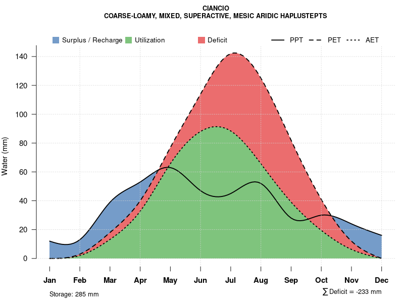 Monthly water balance estimated using a leaky-bucket style model for the CIANCIO soil series. Monthly precipitation (PPT) and potential evapotranspiration (PET) have been estimated from the 50th percentile of gridded values (PRISM 1981-2010) overlapping with the extent of SSURGO map units containing each series as a major component. Monthly PET values were estimated using the method of Thornthwaite (1948). These (and other) climatic parameters are calculated with each SSURGO refresh and provided by the fetchOSD function of the soilDB package. Representative water storage values (“AWC” in the figures) were derived from SSURGO by taking the 50th percentile of profile-total water storage (sum[awc_r * horizon thickness]) for each soil series. Note that this representation of “water storage” is based on the average ability of most plants to extract soil water between 15 bar (“permanent wilting point”) and 1/3 bar (“field capacity”) matric potential. Soil moisture state can be roughly interpreted as “dry” when storage is depleted, “moist” when storage is between 0mm and AWC, and “wet” when there is a surplus. Clearly there are a lot of assumptions baked into this kind of monthly water balance. This is still a work in progress.