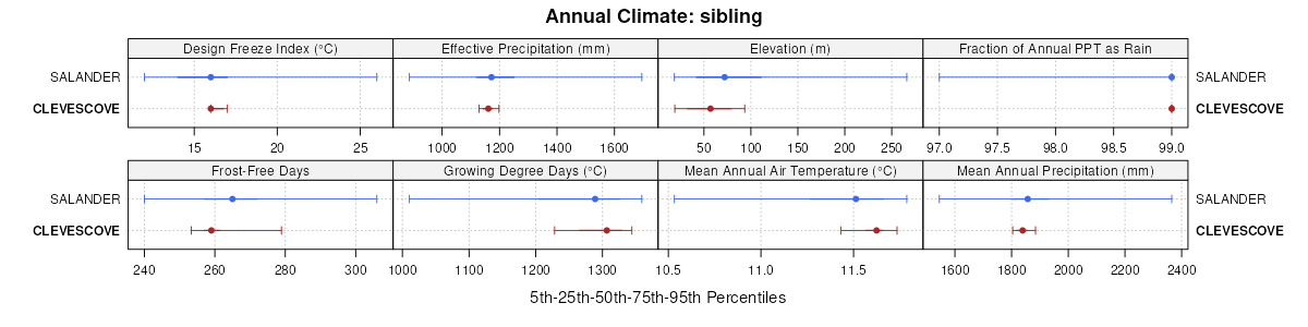 Select annual climate data summaries for the CLEVESCOVE series and competing. Series are sorted according to hierarchical clustering of median values. Source: SSURGO map unit geometry and 1981-2010, 800m PRISM data .