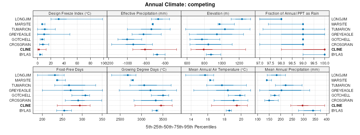 Select annual climate data summaries for the CLINE series and competing. Series are sorted according to hierarchical clustering of median values. Source: SSURGO map unit geometry and 1981-2010, 800m PRISM data .