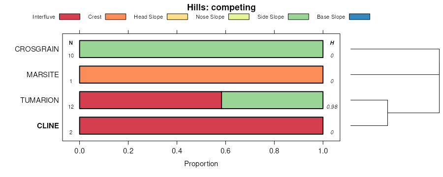 Geomorphic description summaries for the CLINE series and competing. Series are sorted according to hierarchical clustering of proportions and relative hydrologic position within an idealized landform (e.g. top to bottom). Proportions can be interpreted as an aggregate representation of geomorphic membership. Most soil series (SSURGO components) are associated with a hillslope position and one or more landform-specific positions: hills, mountain slopes, terraces, and/or flats. The values printed to the left (number of component records) and right (Shannon entropy) of stacked bars can be used to judge the reliability of trends. Shannon entropy values close to 0 represent soil series with relatively consistent geomorphic association, while values close to 1 suggest lack thereof. Source: SSURGO component records .