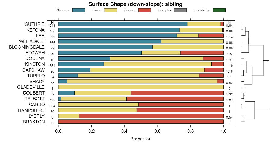 Geomorphic description summaries for the COLBERT series and competing. Series are sorted according to hierarchical clustering of proportions and relative hydrologic position within an idealized landform (e.g. top to bottom). Most soil series (SSURGO components) are associated with a two-dimensional hillslope position and one or more landform-specific, three-dimensional positions: hills, mountain slopes, terraces, and/or flats. The land surface curvature is described across-slope and down-slope. Proportions can be interpreted as an aggregate representation of geomorphic membership. The values printed to the left (number of component records) and right (Shannon entropy) of stacked bars can be used to judge the reliability of trends. Small Shannon entropy values suggest relatively consistent geomorphic association, while larger values suggest lack thereof. Source: SSURGO component records . Learn more about how these data were prepared.