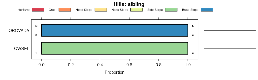 Geomorphic description summaries for the COONSKIN series and siblings. Series are sorted according to hierarchical clustering of proportions and relative hydrologic position within an idealized landform (e.g. top to bottom). Most soil series (SSURGO components) are associated with a hillslope position and one or more landform-specific positions: hills, mountain slopes, terraces, and/or flats. Proportions can be interpreted as an aggregate representation of geomorphic membership. The values printed to the left (number of component records) and right (Shannon entropy) of stacked bars can be used to judge the reliability of trends. Small Shannon entropy values suggest relatively consistent geomorphic association, while larger values suggest lack thereof. Source: SSURGO component records .