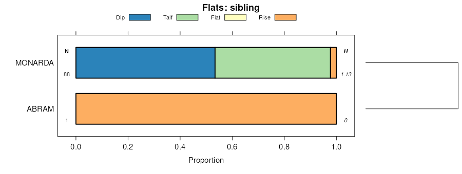 Geomorphic description summaries for the CORINNA series and competing. Series are sorted according to hierarchical clustering of proportions and relative hydrologic position within an idealized landform (e.g. top to bottom). Proportions can be interpreted as an aggregate representation of geomorphic membership. Most soil series (SSURGO components) are associated with a hillslope position and one or more landform-specific positions: hills, mountain slopes, terraces, and/or flats. The values printed to the left (number of component records) and right (Shannon entropy) of stacked bars can be used to judge the reliability of trends. Shannon entropy values close to 0 represent soil series with relatively consistent geomorphic association, while values close to 1 suggest lack thereof. Source: SSURGO component records .