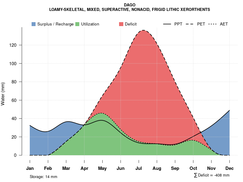 Monthly water balance estimated using a leaky-bucket style model for the DAGO soil series. Monthly precipitation (PPT) and potential evapotranspiration (PET) have been estimated from the 50th percentile of gridded values (PRISM 1981-2010) overlapping with the extent of SSURGO map units containing each series as a major component. Monthly PET values were estimated using the method of Thornthwaite (1948). These (and other) climatic parameters are calculated with each SSURGO refresh and provided by the fetchOSD function of the soilDB package. Representative water storage values (“AWC” in the figures) were derived from SSURGO by taking the 50th percentile of profile-total water storage (sum[awc_r * horizon thickness]) for each soil series. Note that this representation of “water storage” is based on the average ability of most plants to extract soil water between 15 bar (“permanent wilting point”) and 1/3 bar (“field capacity”) matric potential. Soil moisture state can be roughly interpreted as “dry” when storage is depleted, “moist” when storage is between 0mm and AWC, and “wet” when there is a surplus. Clearly there are a lot of assumptions baked into this kind of monthly water balance. This is still a work in progress.
