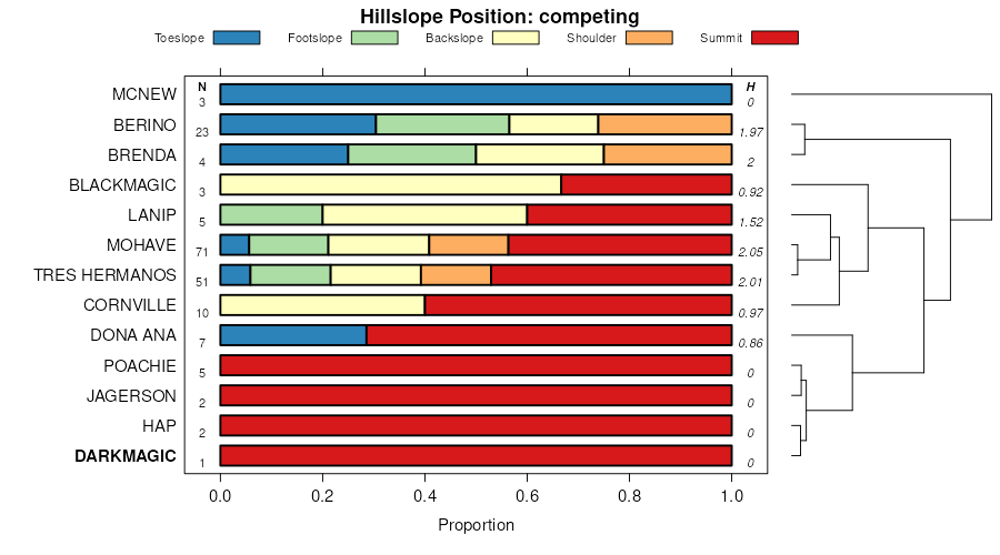 Geomorphic description summaries for the DARKMAGIC series and competing. Series are sorted according to hierarchical clustering of proportions and relative hydrologic position within an idealized landform (e.g. top to bottom). Proportions can be interpreted as an aggregate representation of geomorphic membership. Most soil series (SSURGO components) are associated with a hillslope position and one or more landform-specific positions: hills, mountain slopes, terraces, and/or flats. The values printed to the left (number of component records) and right (Shannon entropy) of stacked bars can be used to judge the reliability of trends. Shannon entropy values close to 0 represent soil series with relatively consistent geomorphic association, while values close to 1 suggest lack thereof. Source: SSURGO component records .