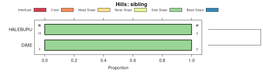 Geomorphic description summaries for the DARKMAGIC series and siblings. Series are sorted according to hierarchical clustering of proportions and relative hydrologic position within an idealized landform (e.g. top to bottom). Most soil series (SSURGO components) are associated with a hillslope position and one or more landform-specific positions: hills, mountain slopes, terraces, and/or flats. Proportions can be interpreted as an aggregate representation of geomorphic membership. The values printed to the left (number of component records) and right (Shannon entropy) of stacked bars can be used to judge the reliability of trends. Small Shannon entropy values suggest relatively consistent geomorphic association, while larger values suggest lack thereof. Source: SSURGO component records .