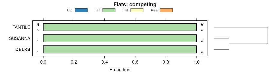 Geomorphic description summaries for the DELKS series and competing. Series are sorted according to hierarchical clustering of proportions and relative hydrologic position within an idealized landform (e.g. top to bottom). Proportions can be interpreted as an aggregate representation of geomorphic membership. Most soil series (SSURGO components) are associated with a hillslope position and one or more landform-specific positions: hills, mountain slopes, terraces, and/or flats. The values printed to the left (number of component records) and right (Shannon entropy) of stacked bars can be used to judge the reliability of trends. Shannon entropy values close to 0 represent soil series with relatively consistent geomorphic association, while values close to 1 suggest lack thereof. Source: SSURGO component records .