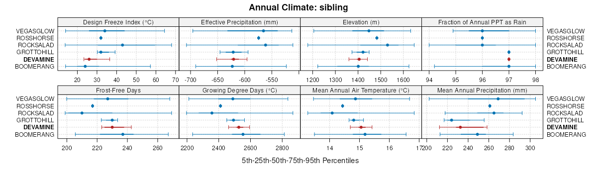 Select annual climate data summaries for the DEVAMINE series and competing. Series are sorted according to hierarchical clustering of median values. Source: SSURGO map unit geometry and 1981-2010, 800m PRISM data .