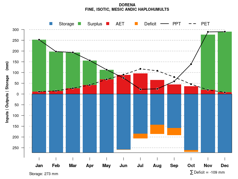 Monthly water balance estimated using a leaky-bucket style model for the DORENA soil series. Monthly precipitation (PPT) and potential evapotranspiration (PET) have been estimated from the 50th percentile of gridded values (PRISM 1981-2010) overlapping with the extent of SSURGO map units containing each series as a major component. Monthly PET values were estimated using the method of Thornthwaite (1948). These (and other) climatic parameters are calculated with each SSURGO refresh and provided by the fetchOSD function of the soilDB package. Representative water storage values (“AWC” in the figures) were derived from SSURGO by taking the 50th percentile of profile-total water storage (sum[awc_r * horizon thickness]) for each soil series. Note that this representation of “water storage” is based on the average ability of most plants to extract soil water between 15 bar (“permanent wilting point”) and 1/3 bar (“field capacity”) matric potential. Soil moisture state can be roughly interpreted as “dry” when storage is depleted, “moist” when storage is between 0mm and AWC, and “wet” when there is a surplus. Clearly there are a lot of assumptions baked into this kind of monthly water balance. This is still a work in progress.
