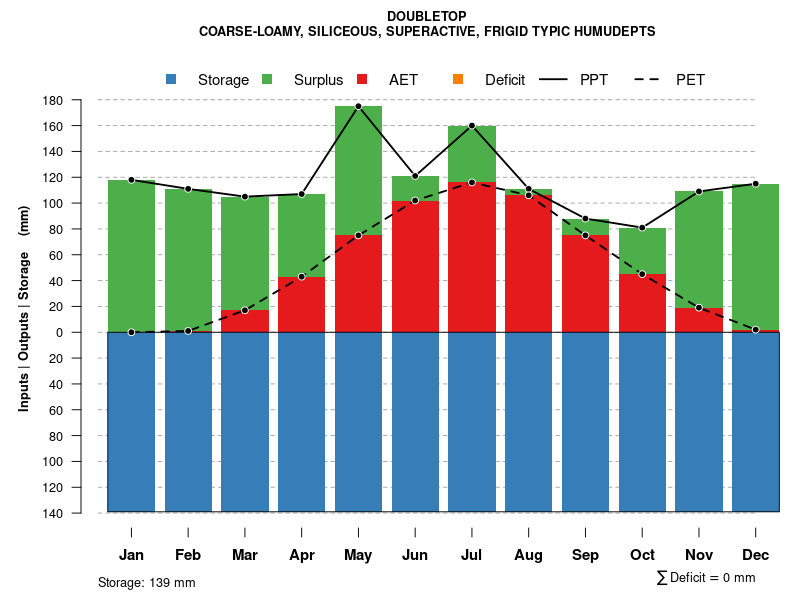 Monthly water balance estimated using a leaky-bucket style model for the DOUBLETOP soil series. Monthly precipitation (PPT) and potential evapotranspiration (PET) have been estimated from the 50th percentile of gridded values (PRISM 1981-2010) overlapping with the extent of SSURGO map units containing each series as a major component. Monthly PET values were estimated using the method of Thornthwaite (1948). These (and other) climatic parameters are calculated with each SSURGO refresh and provided by the fetchOSD function of the soilDB package. Representative water storage values (“AWC” in the figures) were derived from SSURGO by taking the 50th percentile of profile-total water storage (sum[awc_r * horizon thickness]) for each soil series. Note that this representation of “water storage” is based on the average ability of most plants to extract soil water between 15 bar (“permanent wilting point”) and 1/3 bar (“field capacity”) matric potential. Soil moisture state can be roughly interpreted as “dry” when storage is depleted, “moist” when storage is between 0mm and AWC, and “wet” when there is a surplus. Clearly there are a lot of assumptions baked into this kind of monthly water balance. This is still a work in progress.
