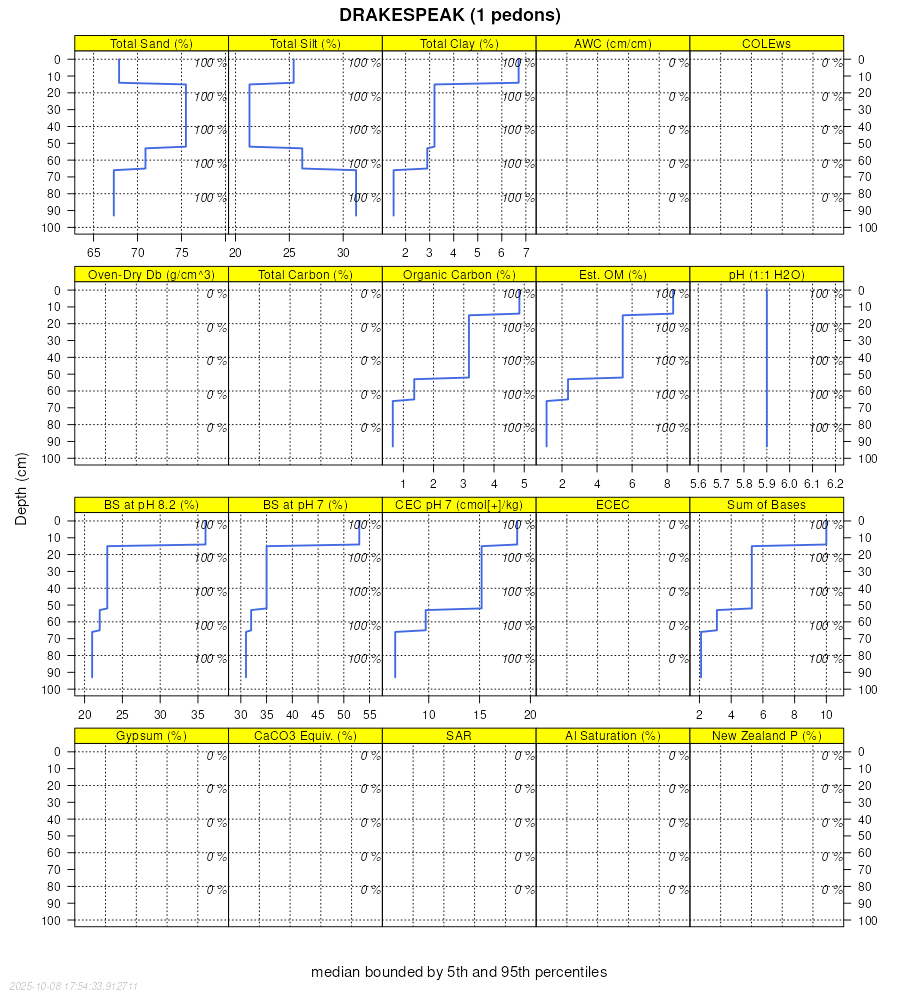 Aggregate lab data for the DRAKESPEAK soil series. This aggregation is based on all pedons with a current taxon name of DRAKESPEAK, and applied along 1-cm thick depth slices. Solid lines are the slice-wise median, bounded on either side by the interval defined by the slice-wise 5th and 95th percentiles. The median is the value that splits the data in half. Five percent of the data are less than the 5th percentile, and five percent of the data are greater than the 95th percentile. Values along the right hand side y-axis describe the proportion of pedon data that contribute to aggregate values at this depth. For example, a value of "90%" at 25cm means that 90% of the pedons correlated to DRAKESPEAK were used in the calculation. Source: KSSL snapshot . Methods used to assemble the KSSL snapshot used by SoilWeb / SDE