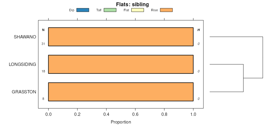 Geomorphic description summaries for the EAGLESNEST series and siblings. Series are sorted according to hierarchical clustering of proportions and relative hydrologic position within an idealized landform (e.g. top to bottom). Most soil series (SSURGO components) are associated with a hillslope position and one or more landform-specific positions: hills, mountain slopes, terraces, and/or flats. Proportions can be interpreted as an aggregate representation of geomorphic membership. The values printed to the left (number of component records) and right (Shannon entropy) of stacked bars can be used to judge the reliability of trends. Small Shannon entropy values suggest relatively consistent geomorphic association, while larger values suggest lack thereof. Source: SSURGO component records .