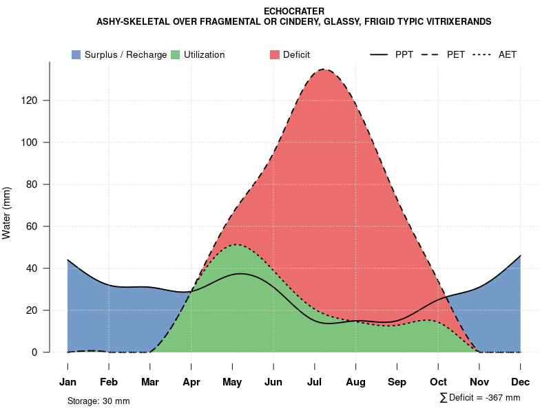 Monthly water balance estimated using a leaky-bucket style model for the ECHOCRATER soil series. Monthly precipitation (PPT) and potential evapotranspiration (PET) have been estimated from the 50th percentile of gridded values (PRISM 1981-2010) overlapping with the extent of SSURGO map units containing each series as a major component. Monthly PET values were estimated using the method of Thornthwaite (1948). These (and other) climatic parameters are calculated with each SSURGO refresh and provided by the fetchOSD function of the soilDB package. Representative water storage values (“AWC” in the figures) were derived from SSURGO by taking the 50th percentile of profile-total water storage (sum[awc_r * horizon thickness]) for each soil series. Note that this representation of “water storage” is based on the average ability of most plants to extract soil water between 15 bar (“permanent wilting point”) and 1/3 bar (“field capacity”) matric potential. Soil moisture state can be roughly interpreted as “dry” when storage is depleted, “moist” when storage is between 0mm and AWC, and “wet” when there is a surplus. Clearly there are a lot of assumptions baked into this kind of monthly water balance. This is still a work in progress.