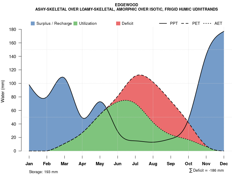 Monthly water balance estimated using a leaky-bucket style model for the EDGEWOOD soil series. Monthly precipitation (PPT) and potential evapotranspiration (PET) have been estimated from the 50th percentile of gridded values (PRISM 1981-2010) overlapping with the extent of SSURGO map units containing each series as a major component. Monthly PET values were estimated using the method of Thornthwaite (1948). These (and other) climatic parameters are calculated with each SSURGO refresh and provided by the fetchOSD function of the soilDB package. Representative water storage values (“AWC” in the figures) were derived from SSURGO by taking the 50th percentile of profile-total water storage (sum[awc_r * horizon thickness]) for each soil series. Note that this representation of “water storage” is based on the average ability of most plants to extract soil water between 15 bar (“permanent wilting point”) and 1/3 bar (“field capacity”) matric potential. Soil moisture state can be roughly interpreted as “dry” when storage is depleted, “moist” when storage is between 0mm and AWC, and “wet” when there is a surplus. Clearly there are a lot of assumptions baked into this kind of monthly water balance. This is still a work in progress.