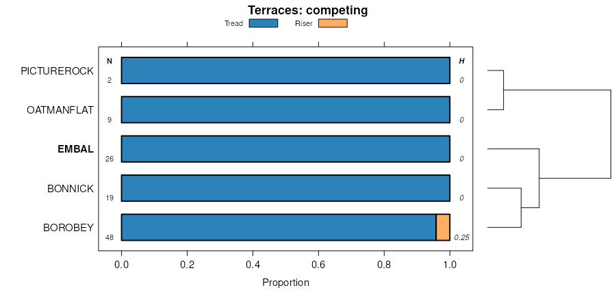 Geomorphic description summaries for the EMBAL series and competing. Series are sorted according to hierarchical clustering of proportions and relative hydrologic position within an idealized landform (e.g. top to bottom). Proportions can be interpreted as an aggregate representation of geomorphic membership. Most soil series (SSURGO components) are associated with a hillslope position and one or more landform-specific positions: hills, mountain slopes, terraces, and/or flats. The values printed to the left (number of component records) and right (Shannon entropy) of stacked bars can be used to judge the reliability of trends. Shannon entropy values close to 0 represent soil series with relatively consistent geomorphic association, while values close to 1 suggest lack thereof. Source: SSURGO component records .