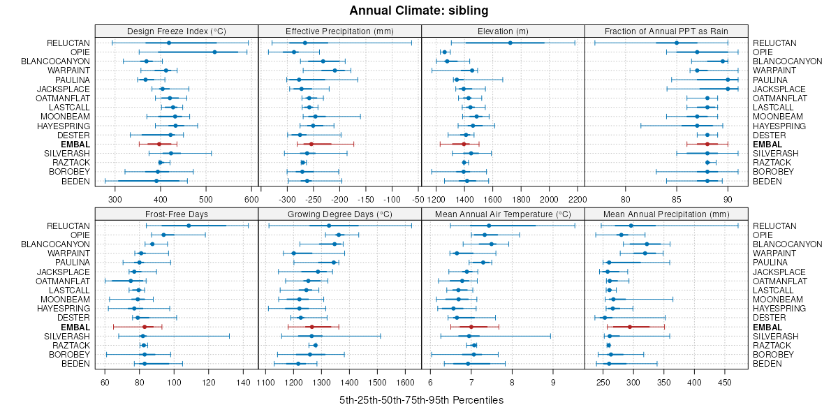 Select annual climate data summaries for the EMBAL series and competing. Series are sorted according to hierarchical clustering of median values. Source: SSURGO map unit geometry and 1981-2010, 800m PRISM data .
