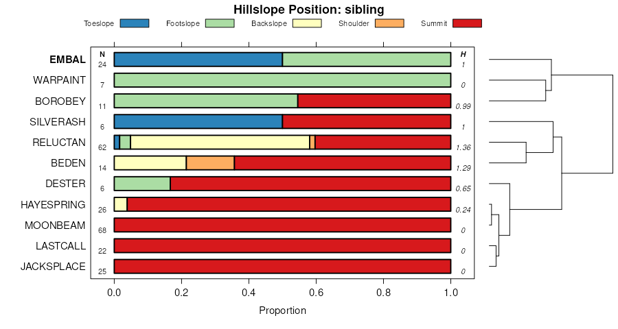 Geomorphic description summaries for the EMBAL series and siblings. Series are sorted according to hierarchical clustering of proportions and relative hydrologic position within an idealized landform (e.g. top to bottom). Most soil series (SSURGO components) are associated with a hillslope position and one or more landform-specific positions: hills, mountain slopes, terraces, and/or flats. Proportions can be interpreted as an aggregate representation of geomorphic membership. The values printed to the left (number of component records) and right (Shannon entropy) of stacked bars can be used to judge the reliability of trends. Small Shannon entropy values suggest relatively consistent geomorphic association, while larger values suggest lack thereof. Source: SSURGO component records .